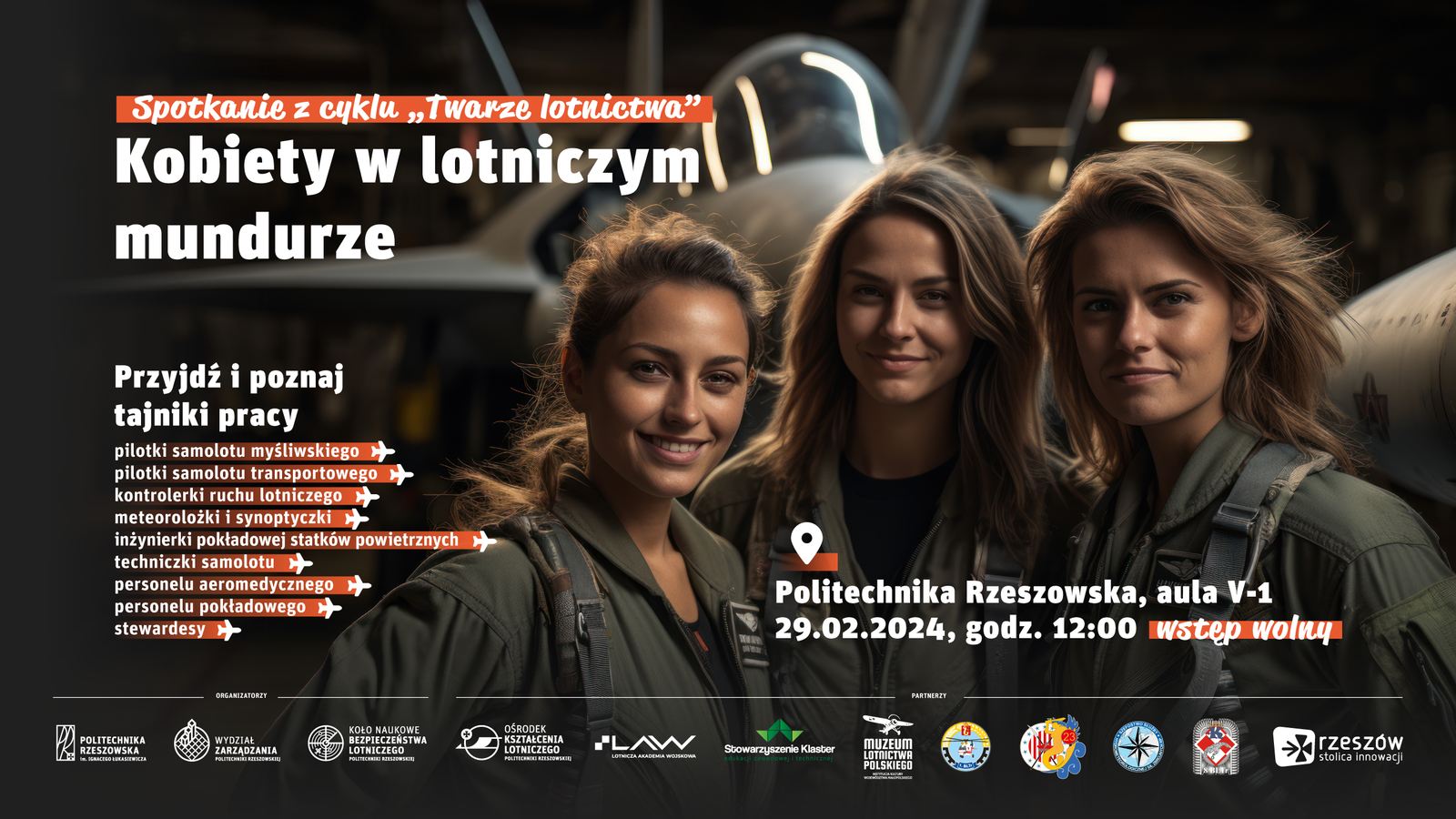 „Kobiety w lotniczym mundurze” czyli kolejna odsłona spotkania z cyklu ,,Twarze lotnictwa”, w którym poruszona została tematyka związana z obecnością i rolą kobiet w Siłach Powietrznych RP. Konferencja obejmowała trzy części: aspekt historyczny, panel dyskusyjny i czas interakcji publiczności z zaproszonymi gośćmi. Celem wydarzenia było przedstawienie punktu widzenia kobiet w zawodach związanych z lotnictwem, a szczególnie z lotnictwem wojskowym.
